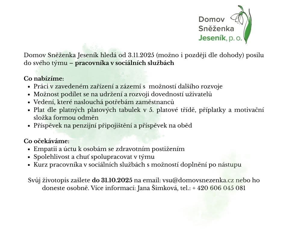 Domov Sněženka Jeseník hledá pracovníka v sociálních službách